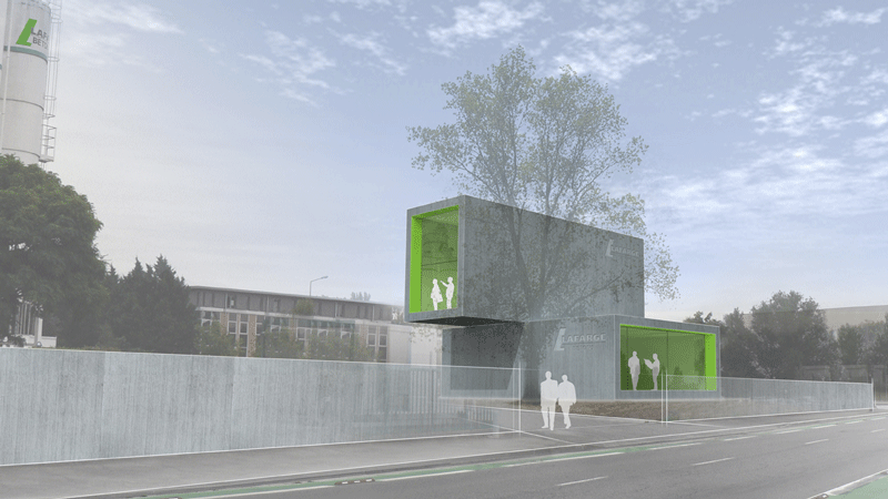 Cette disposition verticale des deux volumes donne au bâtiment une posture affirmée devenant un point de repère du site. Ayant pour mission d’assurer la promotion du «savoir» et du «savoir-faire» du groupe LAFARGE, il nous a paru évident que ces deux volumes soient en béton. Il s’agit d’un béton gris préfabriqué.