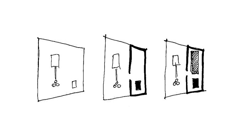 Le show-room est constitué de deux parallelépipèdes de sections différentes. Ces deux volumes sont disposés l’un sur l’autre et sont perpendiculaires l’un par rapport à l’autre.