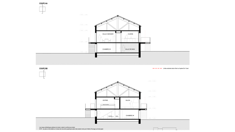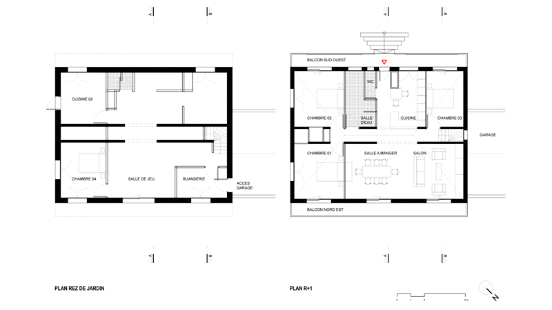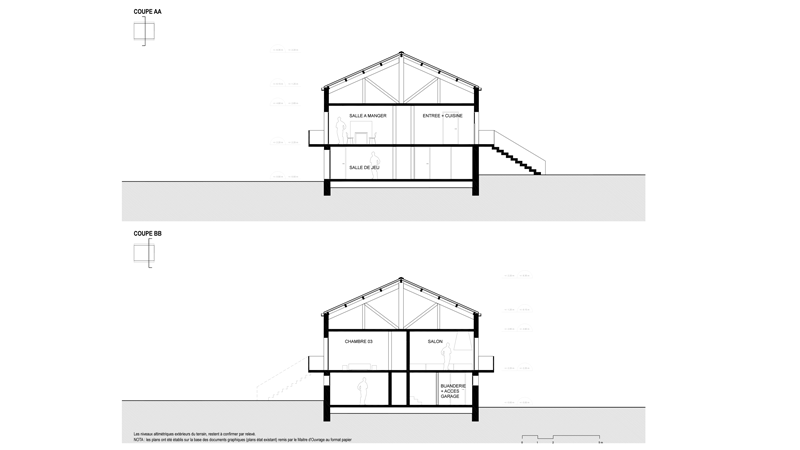 La maison n’étant occupée que sur un seul des deux niveaux, à savoir l’étage, le projet consiste à ré-aménager les deux niveaux pour investir pleinement la Maison. A l’étage on trouve les espaces cuisine, salon, séjour et bureau ; au rez-de-jardin les espaces des chambres. La nouvelle position des escaliers joue un rôle prépondérant dans le ré-aménagement de la maison ainsi que dans le rapport qu’entretiennent le rez-de jardin et l’étage. Par la même la maison retrouve une relation entre le jardin et l’étage.